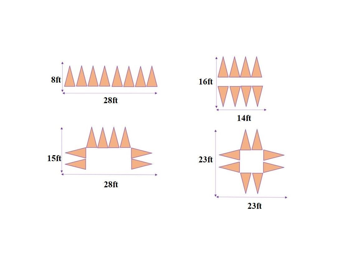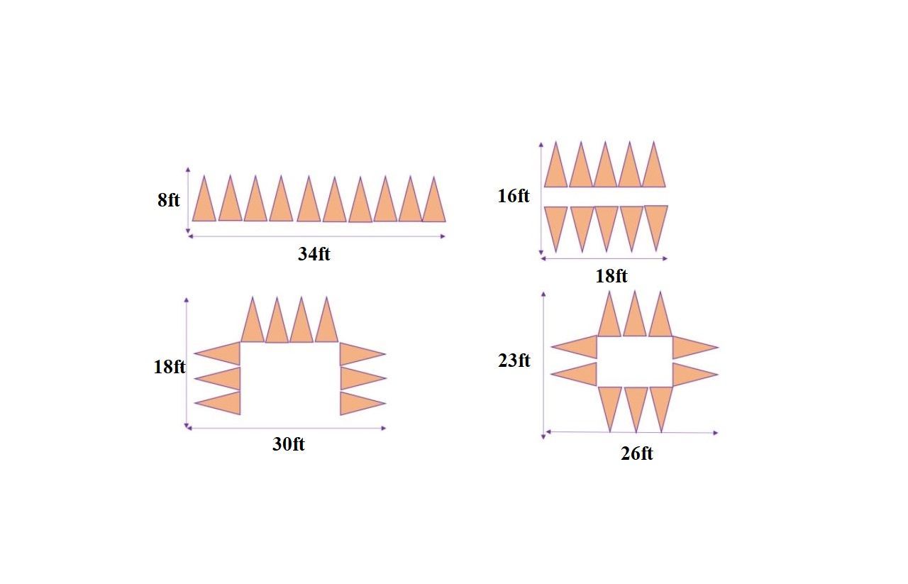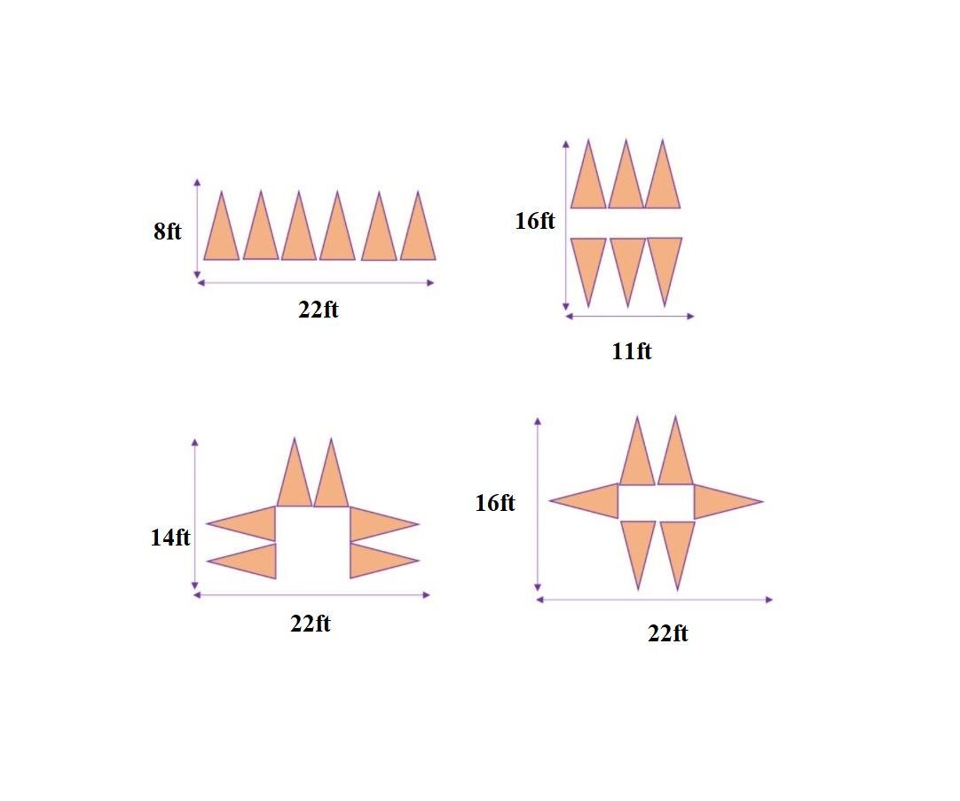 We recommend a minimum of 3ft x 8ft for each teepee, however; there are options as far as configurations go. See the photos for sizing guidelines and layout options. Please make sure you also account for walking space.